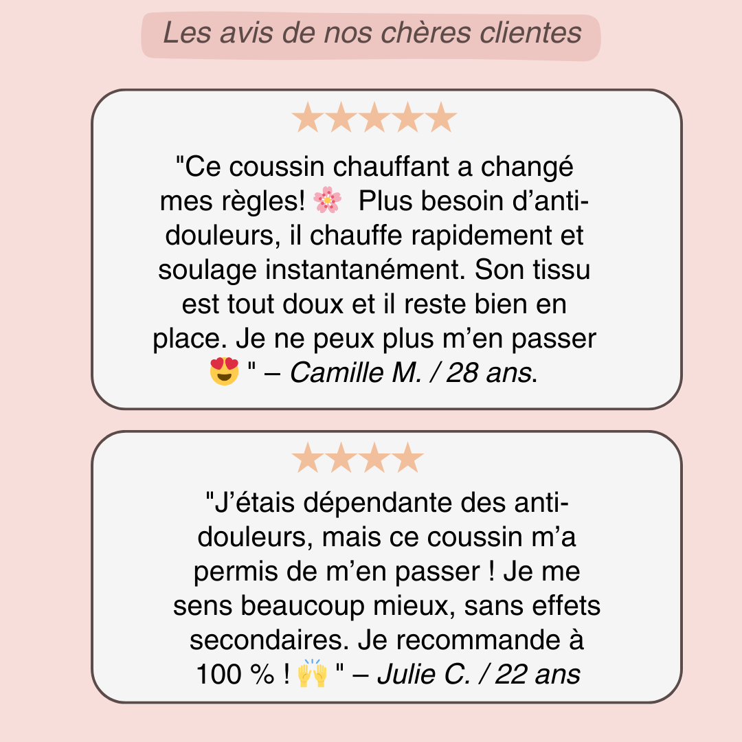 J’étais fatiguée de prendre des anti-douleurs tous les mois. J’ai testé ce coussin chauffant sans trop y croire… mais j’ai été bluffée ! En moins de 10 minutes, mes douleurs se sont atténuées. En plus, il est super confortable, joli et facile à utiliser. C’est un vrai soulagement naturel. Je ne pourrais plus m’en passer aujourd’hui.